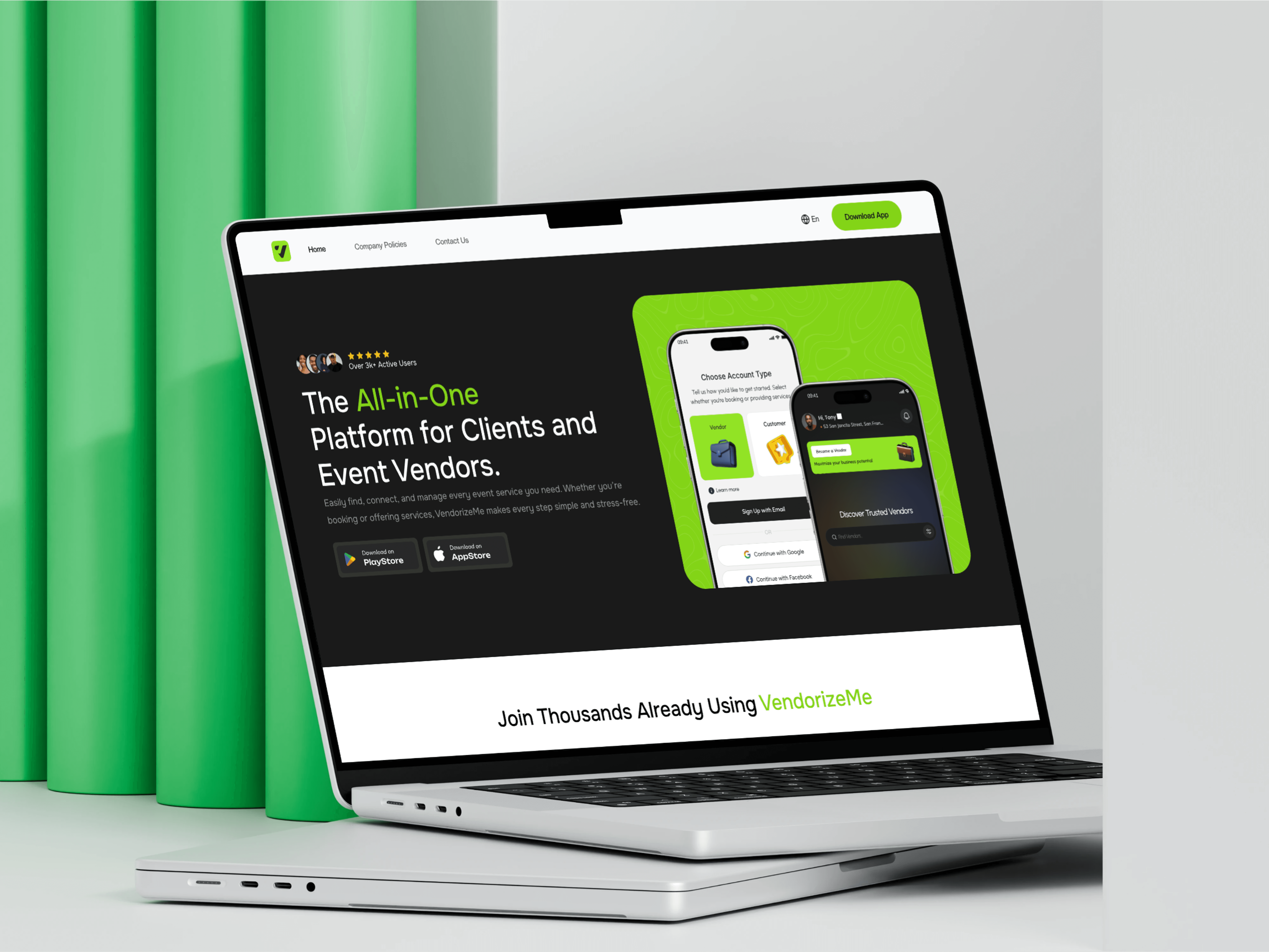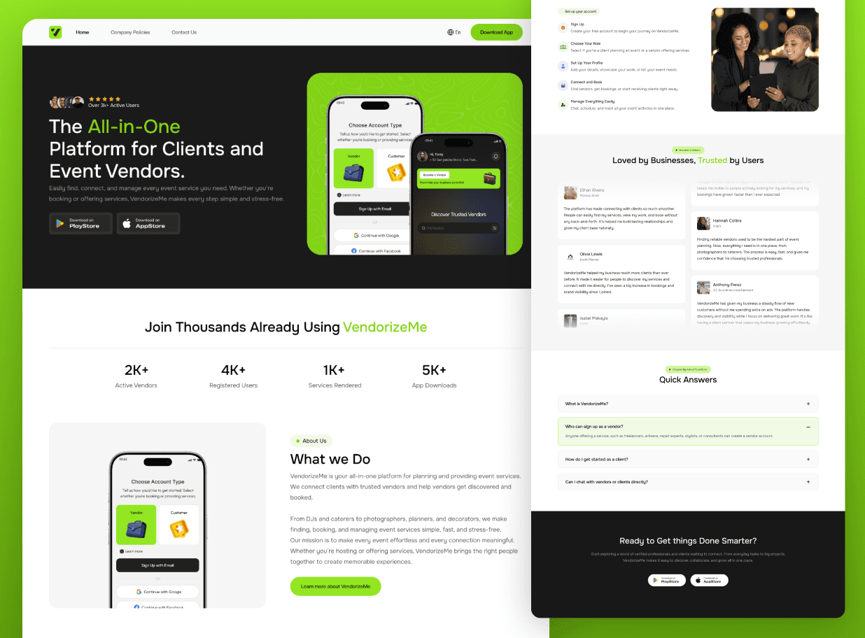 Special attention was given to responsiveness, ensuring the landing page works well across devices. The final design balances functionality and visual appeal, presenting VendorizeMe as a reliable, modern solution for vendor booking and service provision.